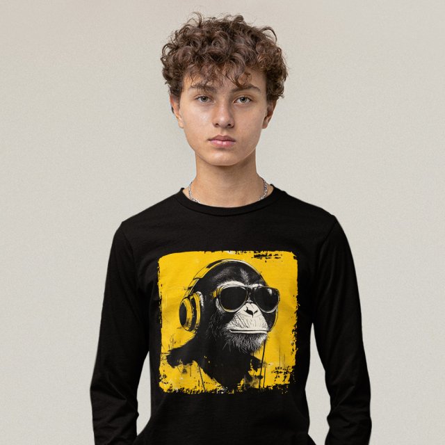 Cool Monkey Long Sleeve T-Shirt is proudly made with 7x less water than average manufacturers, in recycle-friendly facilities that also guarantee zero sweatshop conditions. Gift for DJ T-Shirt is designed and printed in California.
