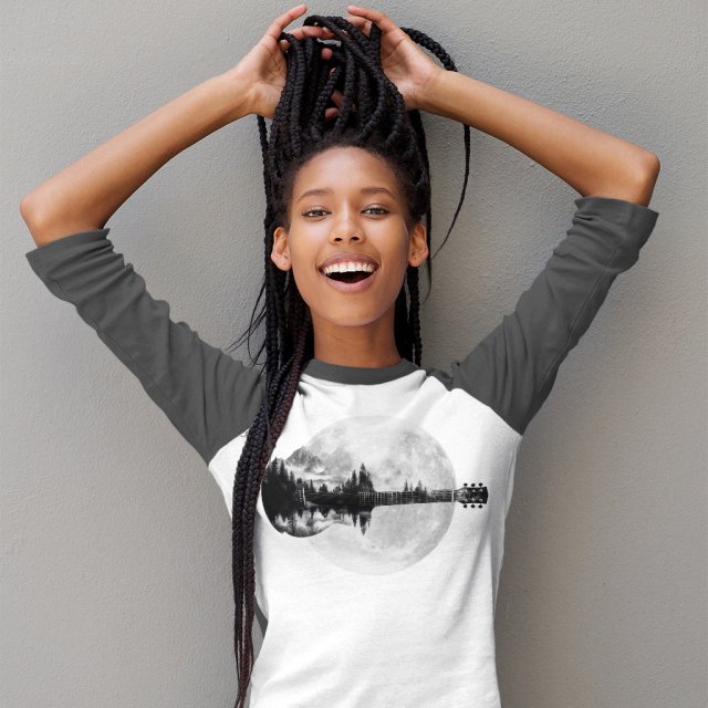 Guitar Lake Shadow Full Moon Baseball T-Shirt is proudly made with 7x less water than average manufacturers, in recycle-friendly facilities that also guarantee zero sweatshop conditions. Gift for Guitarist 3/4 Sleeve is designed and printed in California.