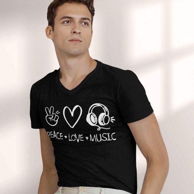 Peace Love Music V-Neck T-Shirt is proudly made with 7x less water than average manufacturers, in recycle-friendly facilities that also guarantee zero sweatshop conditions