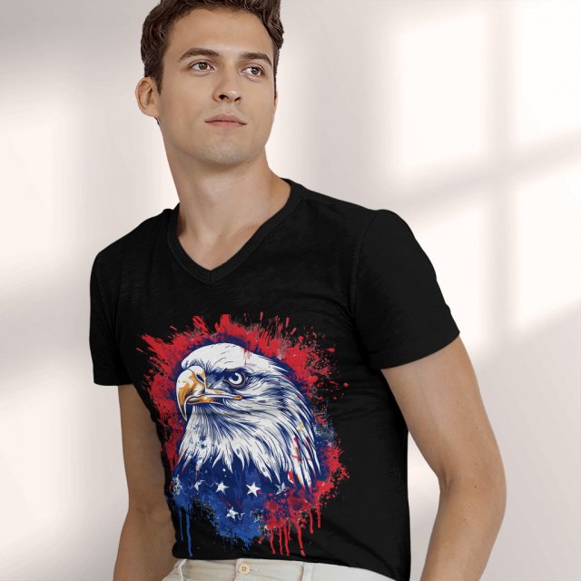 USA Bald Eagle V-Neck T-Shirt is proudly made with 7x less water than average manufacturers, in recycle-friendly facilities that also guarantee zero sweatshop conditions