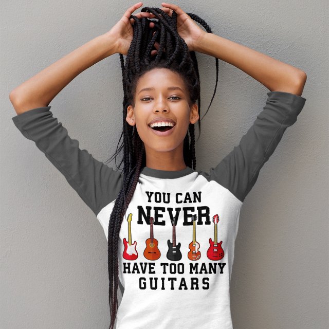 You Can Never Have Too Many Guitars Baseball T-Shirt is proudly made with 7x less water than average manufacturers, in recycle-friendly facilities that also guarantee zero sweatshop conditions. Funny Vintage 3/4 Sleeve is designed and printed in California.