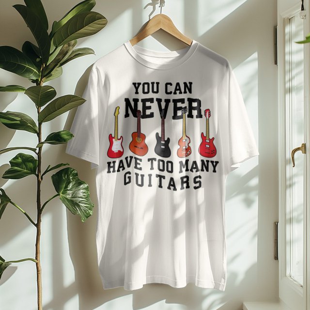 You Can Never Have Too Many Guitars T-Shirt is no ordinary piece of clothing. Its taped neck and shoulders, double-needle sleeve and bottom hems, and quarter-turned construction provide a retail fit for clothing that’s true to size. Guitar Player Heavy Cotton Tee is Designed and printed in California.